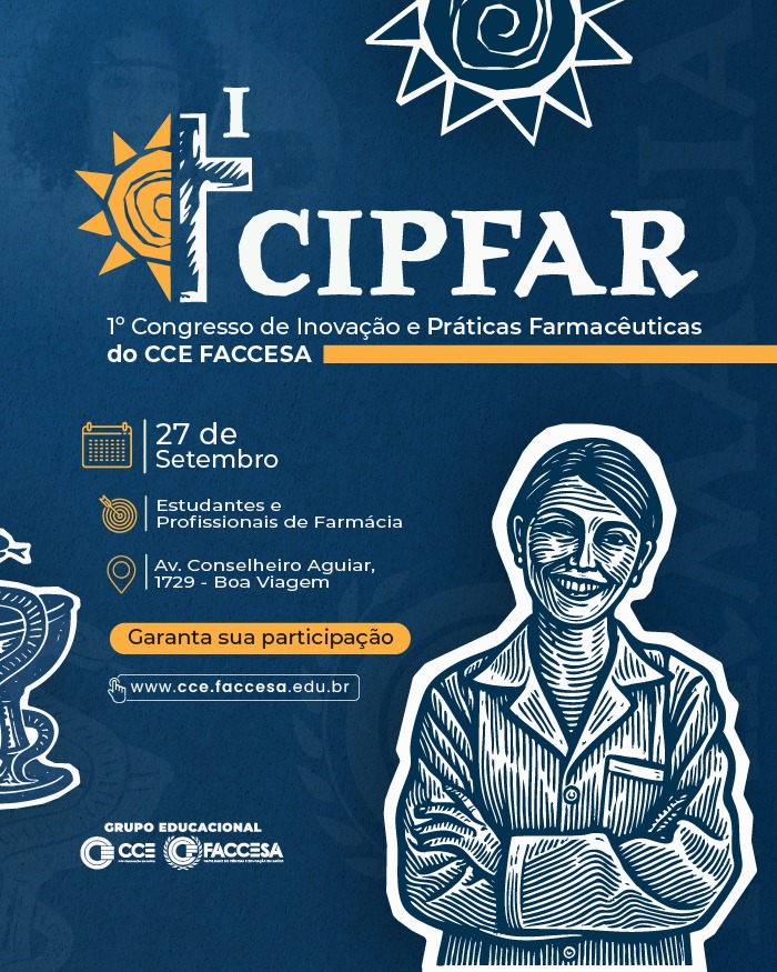 No dia 27 de setembro de 2025 (sábado), o CCE FACCESA realiza o 1° CIPFAR – Congresso de Inovação e Práticas Farmacêuticas, um evento exclusivo para estudantes e profissionais que desejam ampliar seus conhecimentos e fortalecer sua atuação no cuidado farmacêutico.