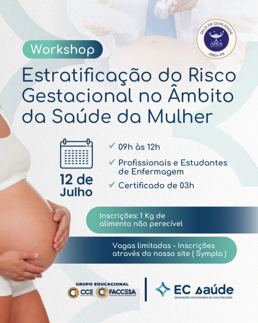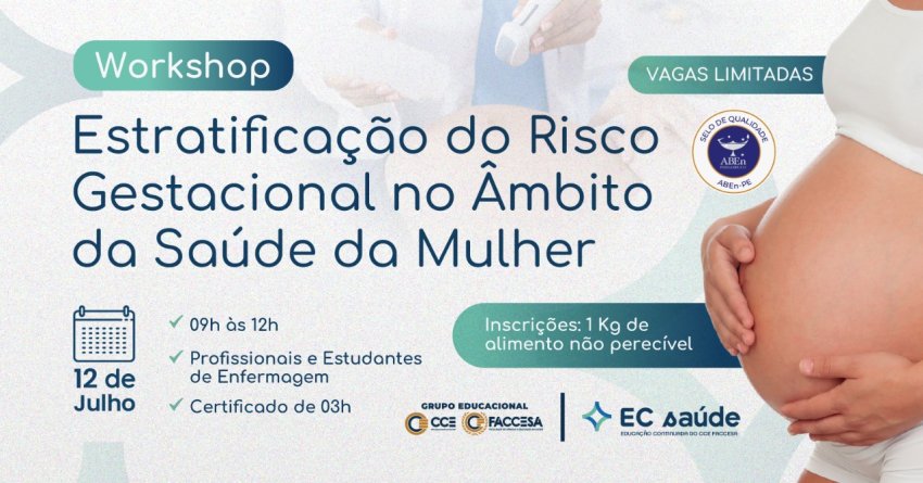 O CCE FACCESA convida estudantes e profissionais da área de Enfermagem para participarem de um workshop essencial para quem atua ou deseja atuar na atenção à saúde da mulher: Estratificação do Risco Gestacional no Âmbito da Saúde da Mulher.